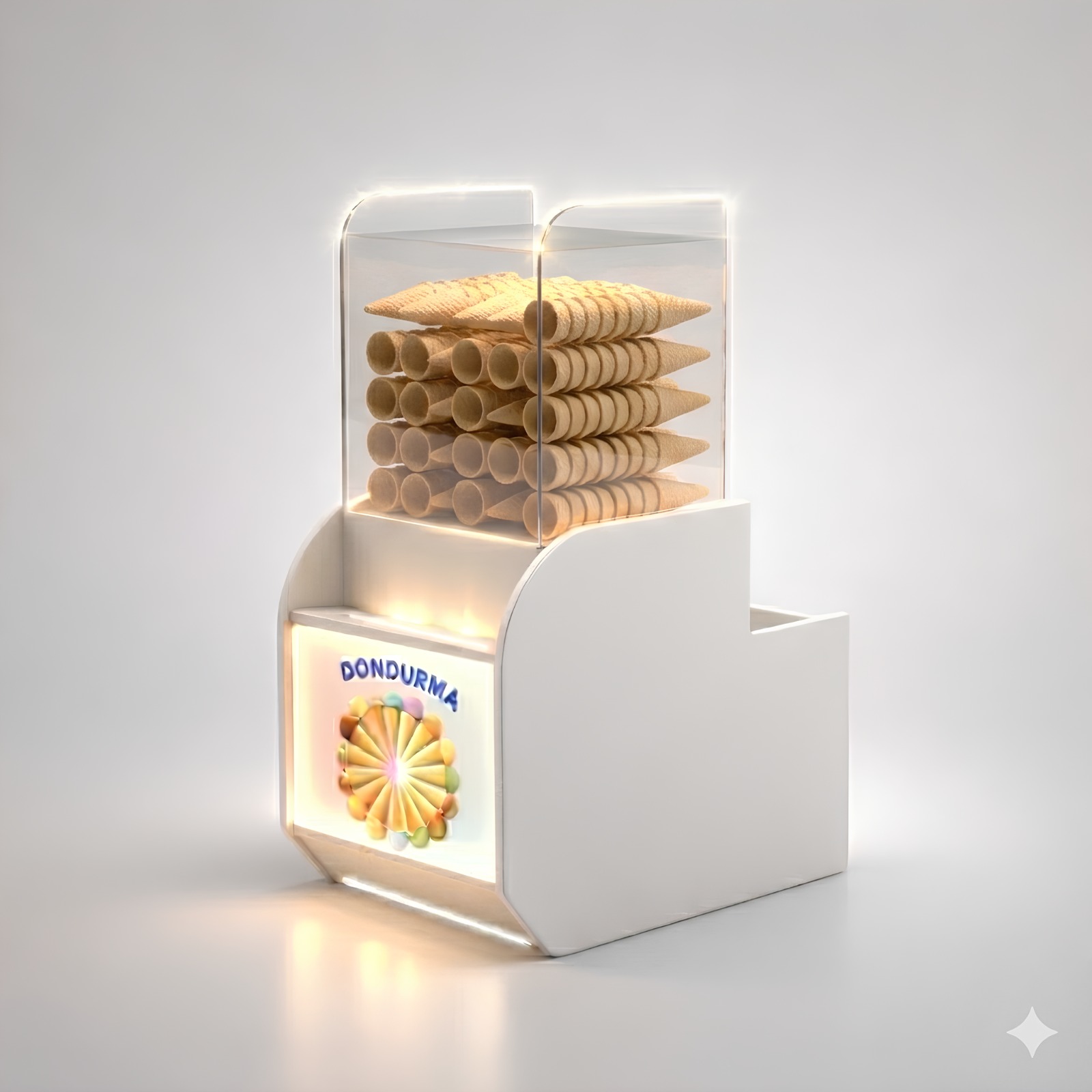 Dondurma külah dolabı, işletmenizde külahları hem hijyenik hem de düzenli bir şekilde sergilemenizi sağlayan modern ve estetik bir çözümdür. Şeffaf pleksi yapısı sayesinde ürünler kolayca görülebilirken, dış etkenlerden korunarak maksimum hijyen sağlar.