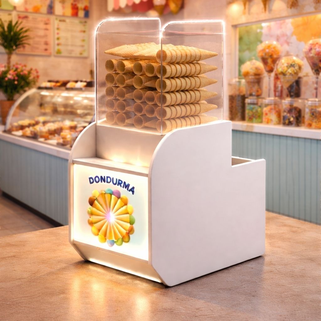 Dondurma külah dolabı, işletmenizde külahları hem hijyenik hem de düzenli bir şekilde sergilemenizi sağlayan modern ve estetik bir çözümdür. Şeffaf pleksi yapısı sayesinde ürünler kolayca görülebilirken, dış etkenlerden korunarak maksimum hijyen sağlar.