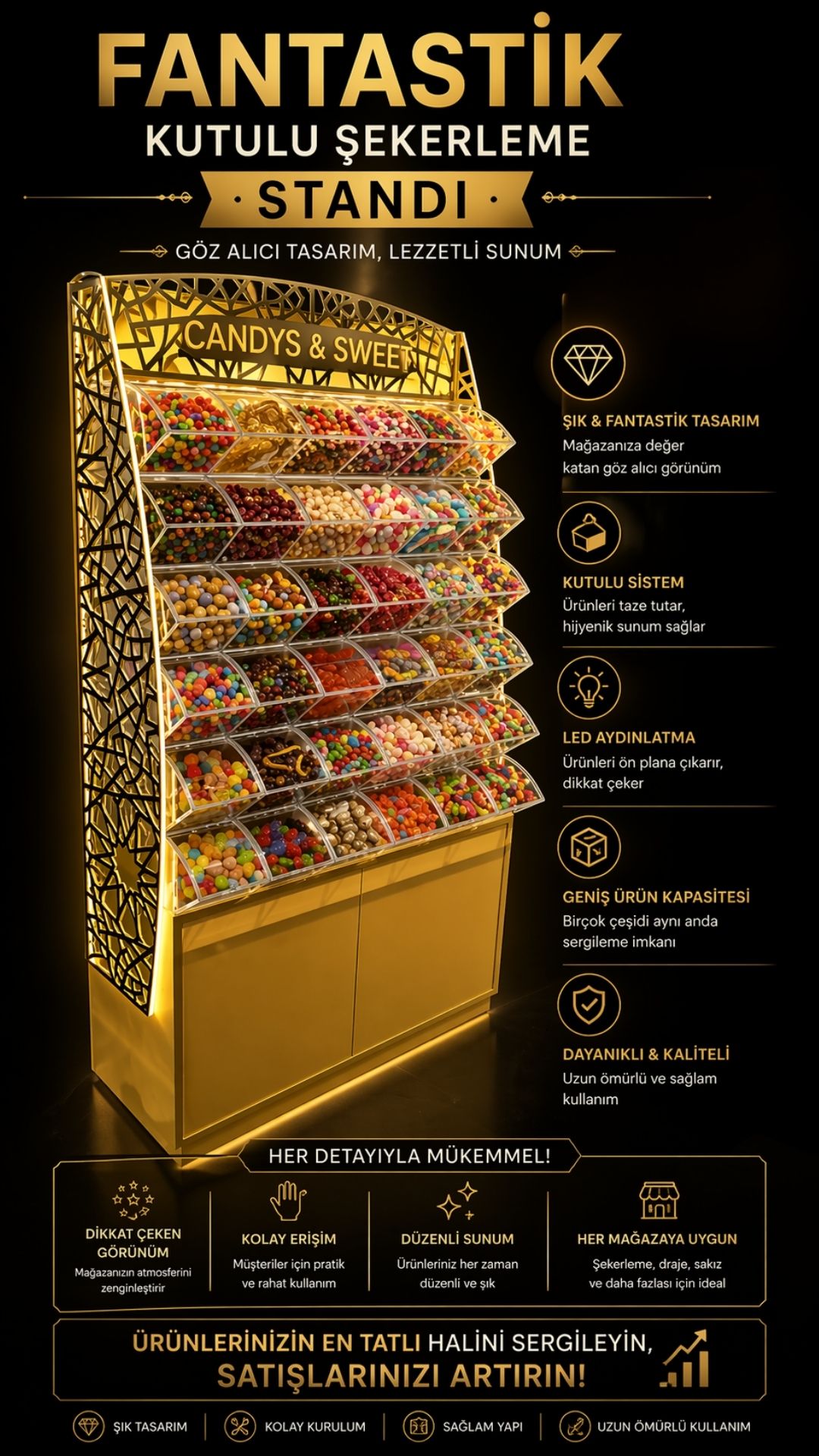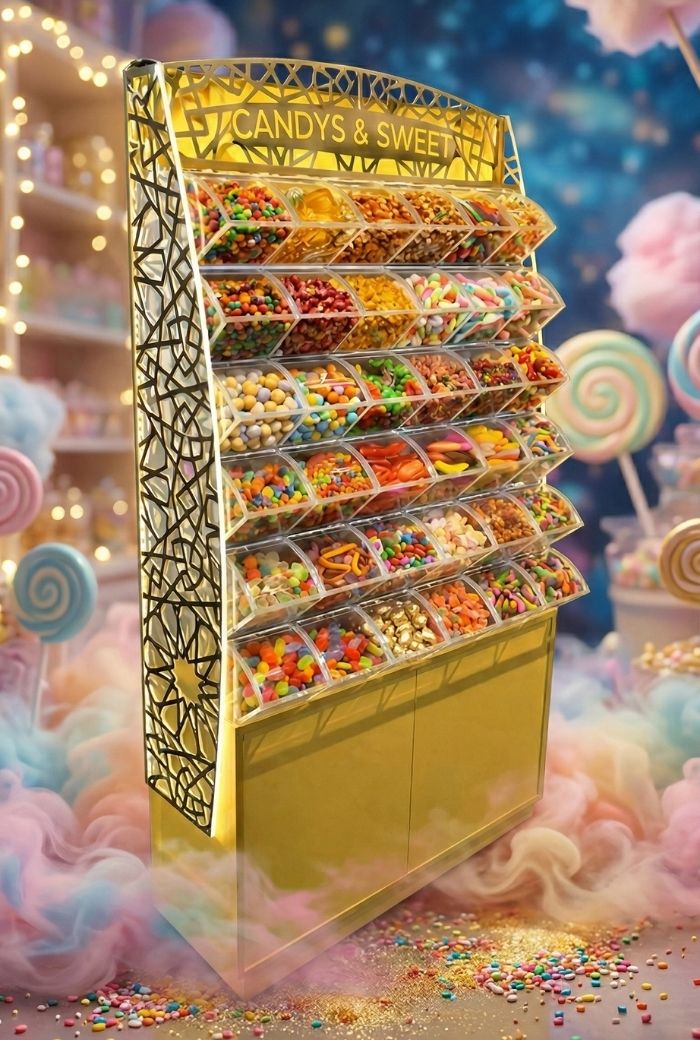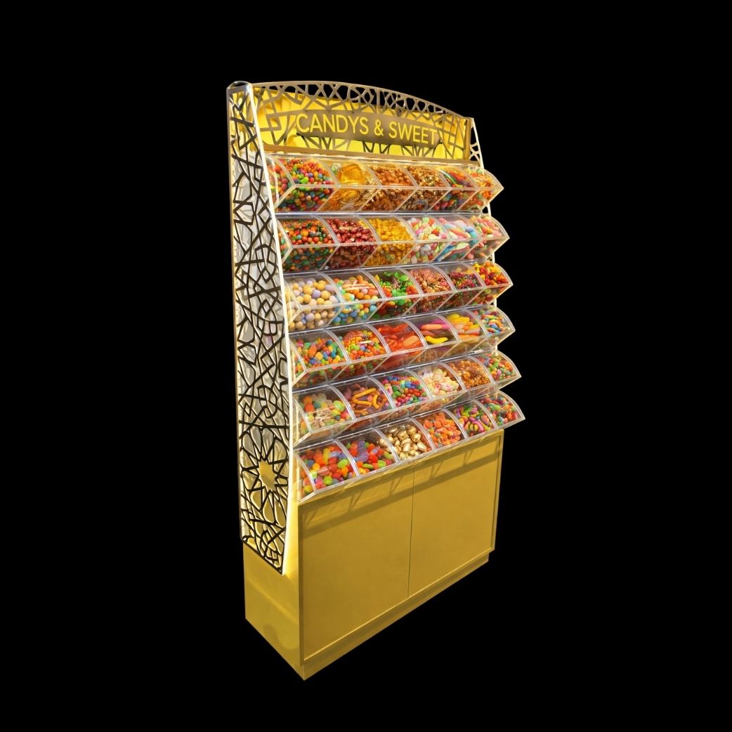 Fantastik Kutu Şekerleme Standı, şekerleme, draje ve benzeri ürünlerin dikkat çekici, düzenli ve hijyenik şekilde sergilenmesi için tasarlanmıştır. Aydınlatmalı üst başlığı ve modern tasarımı sayesinde mağaza içerisinde güçlü bir görsel etki oluşturur ve müşteri ilgisini artırır.