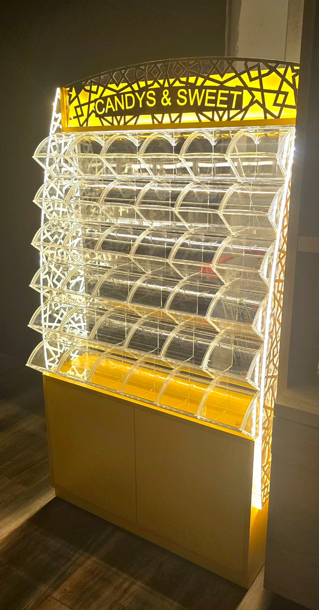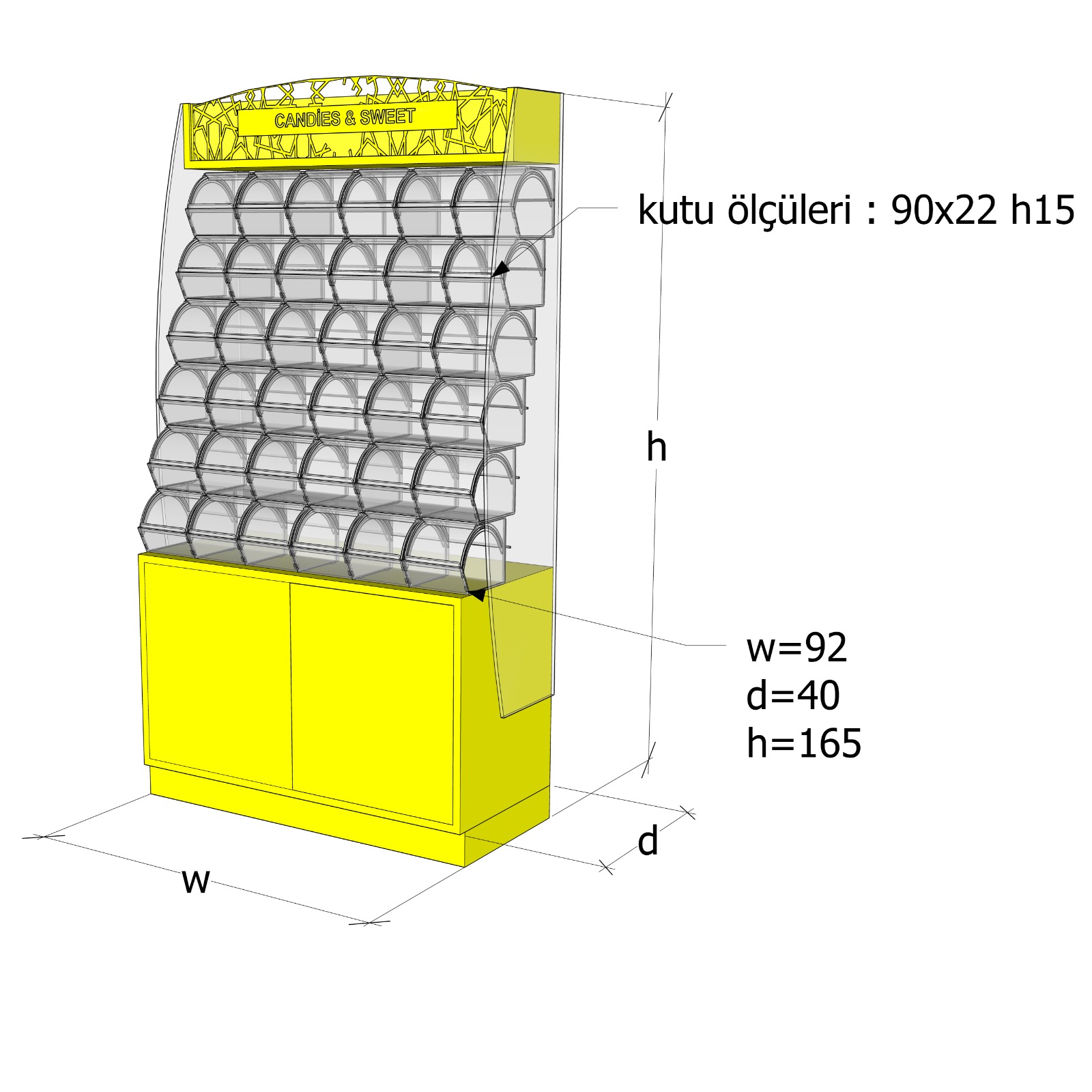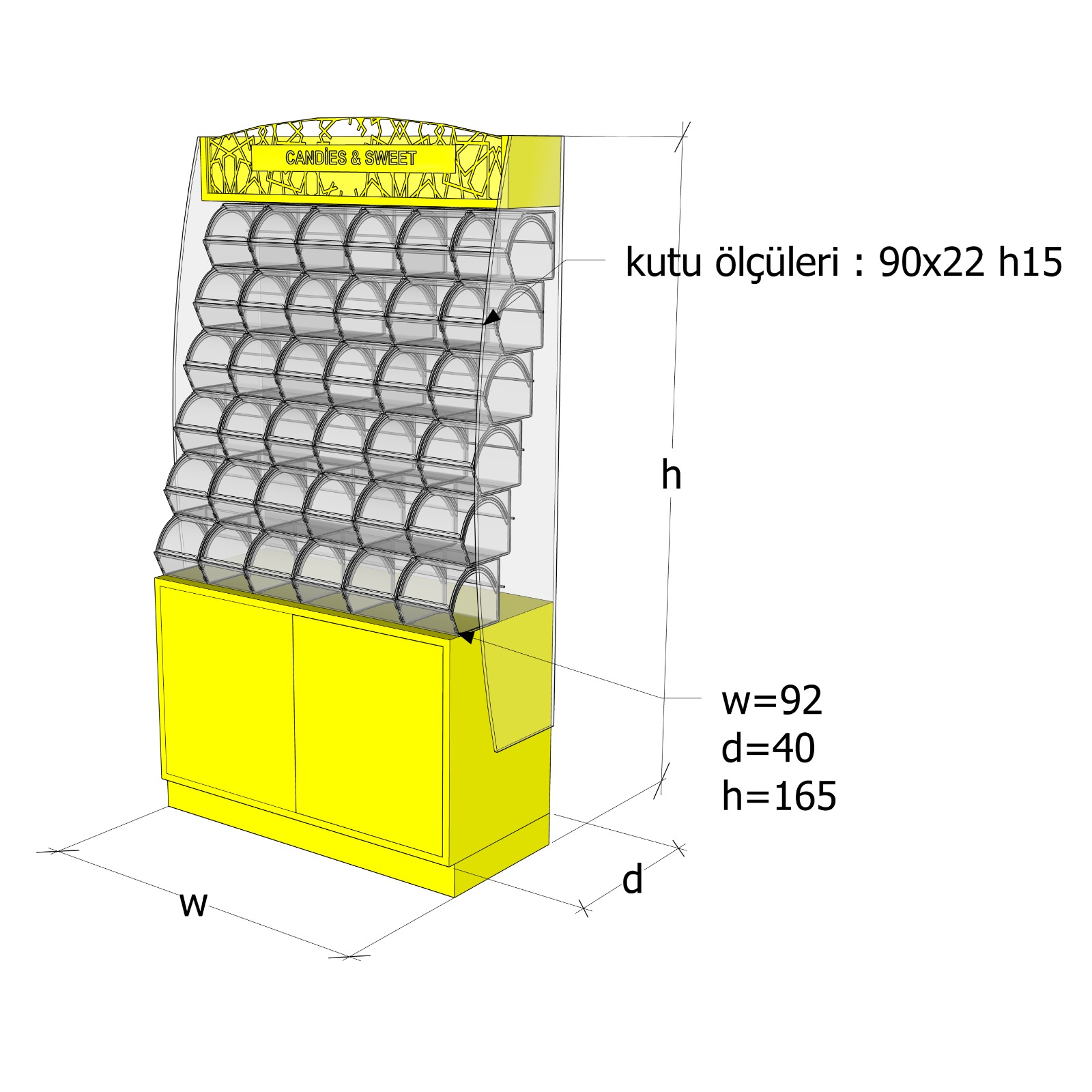 Fantastik Kutu Şekerleme Standı, şekerleme, draje ve benzeri ürünlerin dikkat çekici, düzenli ve hijyenik şekilde sergilenmesi için tasarlanmıştır. Aydınlatmalı üst başlığı ve modern tasarımı sayesinde mağaza içerisinde güçlü bir görsel etki oluşturur ve müşteri ilgisini artırır.