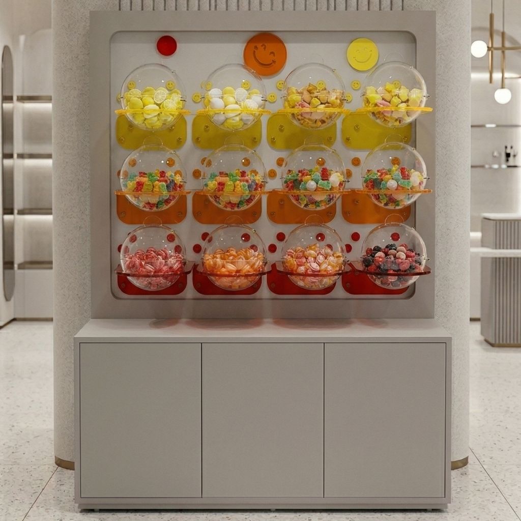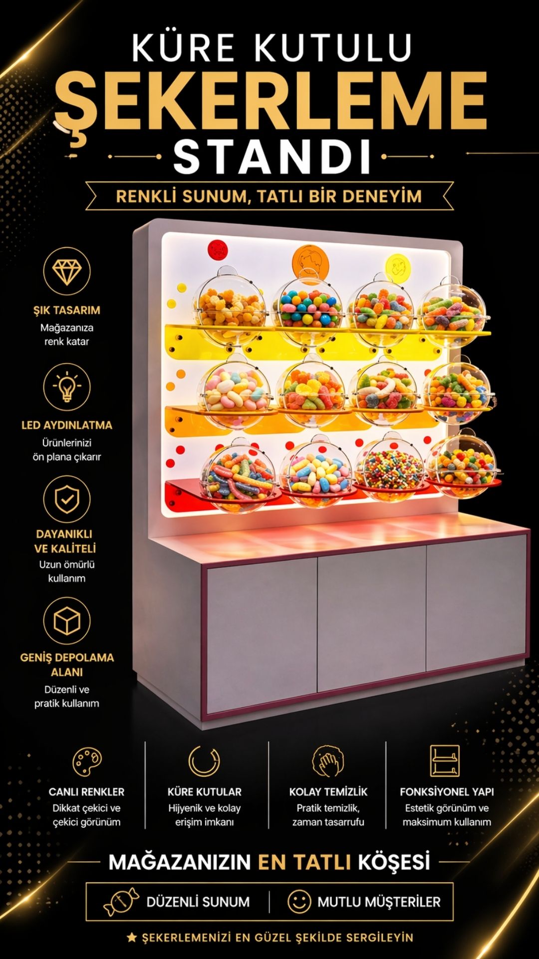 Küre Kutulu Şekerleme Standı; AVM’ler, süpermarketler, oyuncak mağazaları ve yüksek müşteri trafiğine sahip satış noktaları için tasarlanmış, maksimum görünürlük ve yüksek ürün kapasitesi sunan özel bir teşhir çözümüdür. Şeffaf küre kutular sayesinde ürünler her açıdan net şekilde görülebilir, renkli ve dikkat çekici sunum ile impuls satışları artırır.