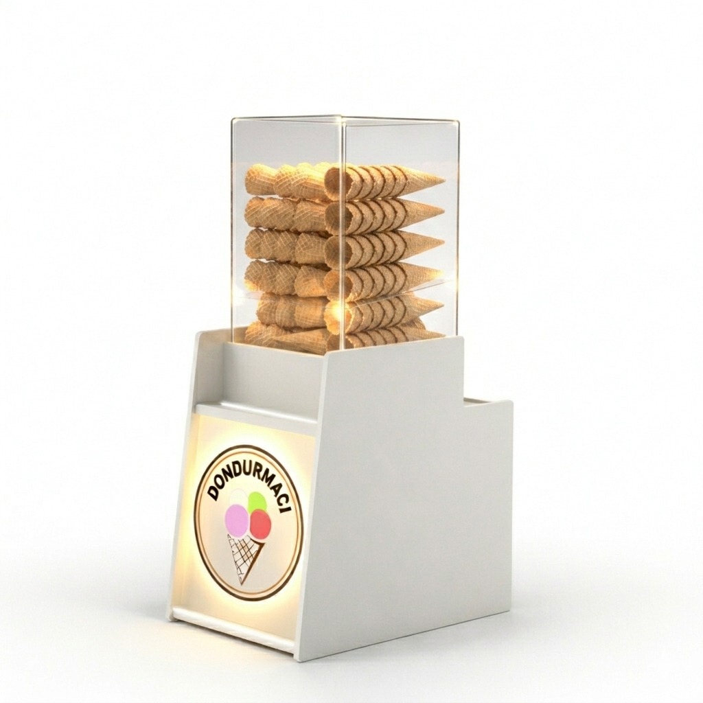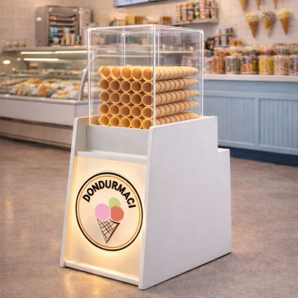 Dondurma külah dolabı, işletmenizde külahları hem hijyenik hem de düzenli bir şekilde sergilemenizi sağlayan modern ve estetik bir çözümdür. Şeffaf pleksi yapısı sayesinde ürünler kolayca görülebilirken, dış etkenlerden korunarak maksimum hijyen sağlar.